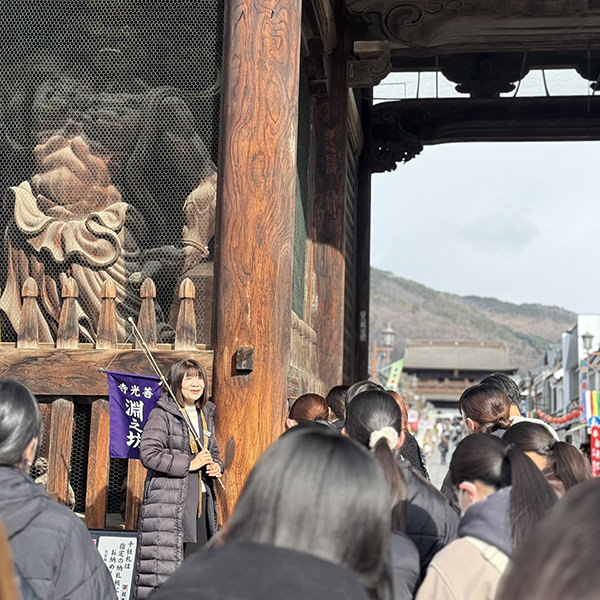善光寺の宿坊「淵之坊」の職員の方に善光寺の成り立ちのお話を伺い、仁王門・六地蔵等を案内して頂き、善光寺本堂のお戒壇巡りも体験することができました。その後善光寺史料館へ足を延ばして、善光寺の貴重な資料や仏像等も拝見させていただきました。ひとつひとつ丁寧に説明・解説して頂き、いつでも誰でも参拝できる善光寺が本学の地元にあることを改めてうれしく思いました。