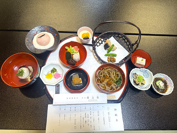 昼食は、「淵之坊」で精進料理をいただきました。料理長さんから精進料理に用いられる食材は、動物性の食品はもちろんのこと植物であってもニンニク等の香りの強いものは用いない等のお話をおききしました。参加した学生たちは、日頃から調理実習を通して食物や調理に興味を持っていることもあり、一品一品の食材や調理方法について意見を交わしながら、お料理をおいしくいただきました。