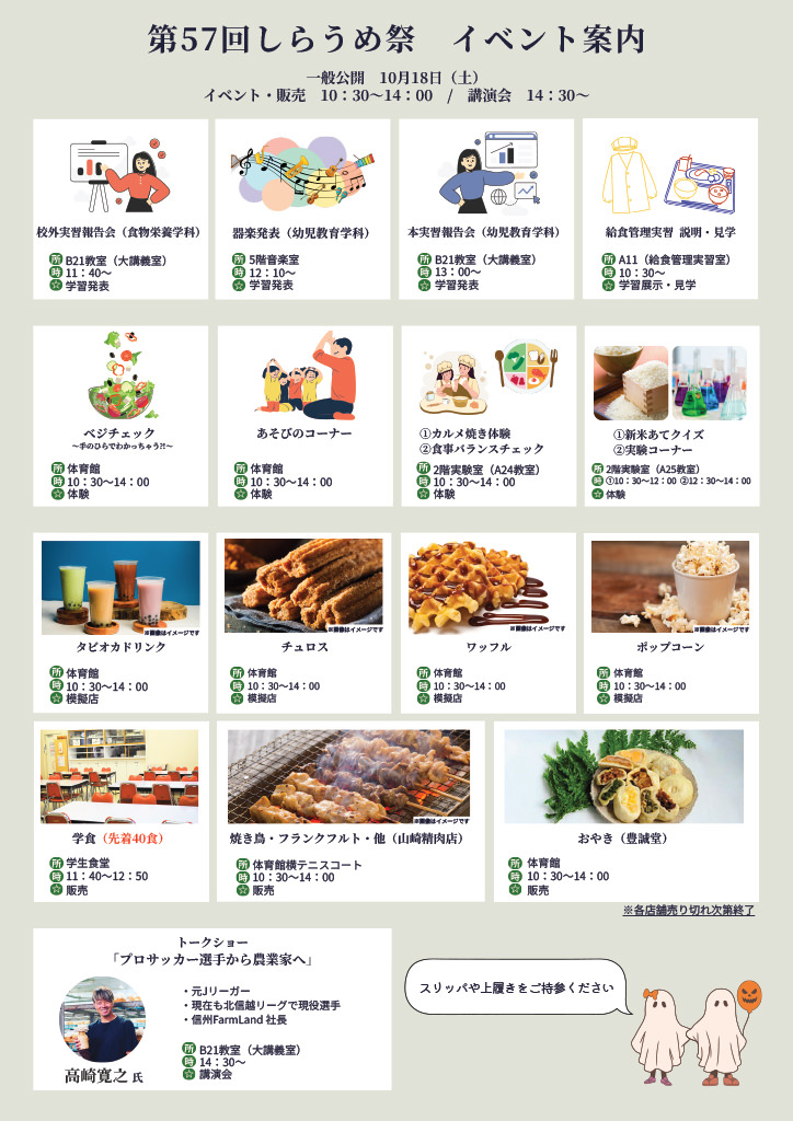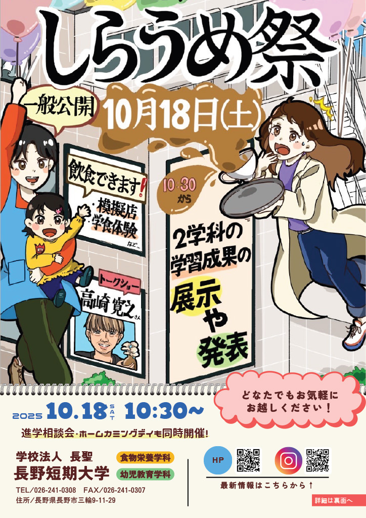 半世紀以上の歴史のある本学の大学祭「しらうめ祭」です。しらうめ祭は毎年秋に開催され、レストラン、軽食の販売コーナーなど持ち味のある展示・出店や講演会など多様な企画が満載の大学祭です。